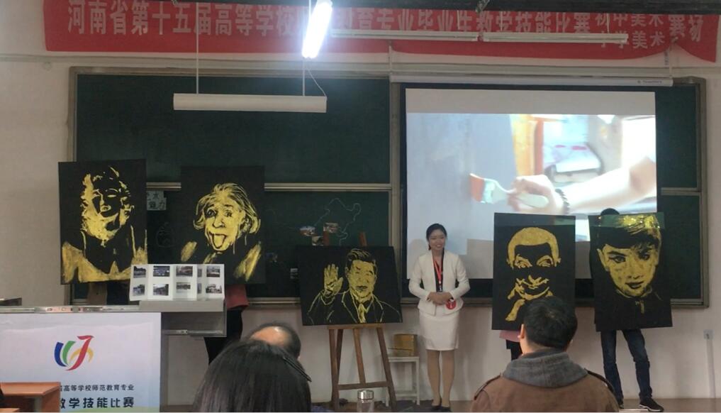 281名选手在14个赛场进行比赛,分为初中组、小学组16个学科以及学前教育本、专科2个小组。比赛内容包含说课、答辩、才艺展示和专业技能展示等环节,比赛竞争激烈,信阳师范学院beat365英国官方网站参赛选手苏红在初中美术组十一人中,抽签说课题目为《传统民居的魅力》,在说课过程与答辩环节中,选手充满自信,稳定发挥,并在才艺展示金粉画环节赢得全场掌声,获得一等奖。