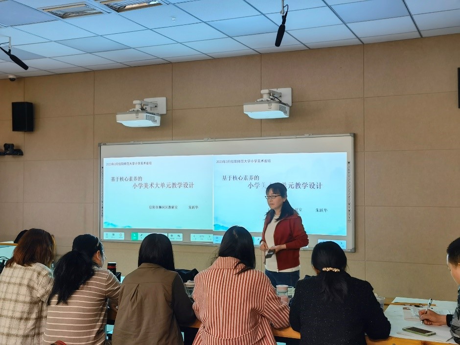 3月16日上午,朱跃华老师为省培学员开启第一场《基于核心素养的小学美术大单元教学设计》系列专题讲座。讲座中,她利用实际案例向学员介绍“大概念”该如何应用于实际的课堂教学,向学员们展示自己设计的民间美术课题,使学员们对本次的课题内容有了深入的了解。朱跃华老师的精彩讲解赢得了学员们的阵阵掌声。通过朱跃华老师的讲解,学员们对美术大单元教学设计有了更深入和直观的了解,为之后的美术教学实践提供了帮助。