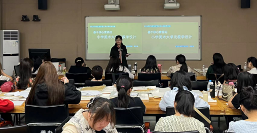 2023年9月18日上午八点半,beat365英国官方网站“国培计划”骨干教师培训班开课。本次课程由朱跃华老师讲授,以《核心素养下的小学美术大单元教学设计》为主题。朱跃华老师是中小学美术教研员,曾多次执教省市级优质课,是省市级学术技术带头人、省市级省培骨干教师讲师团讲师、河南省美术骨干教师、河南省小学美术网络名师工作室主持人、河南省中小学美术优质课评审专家组成员、信阳市学术技术带头人,也是信阳师院美术硕士的校外导师、浉河区美协副主席。