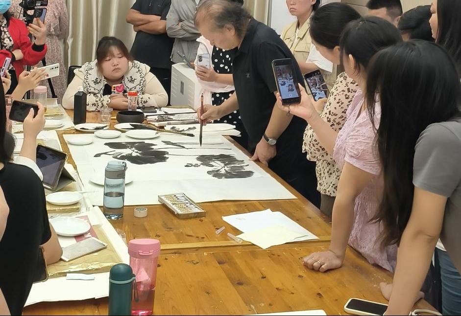 彭西春首先讲解了国画花鸟的发展历程。随后便为大家示范写意花鸟画创作——小写意荷花图。彭老师强调不同结构之间的用笔应该有所变化,不同结构的墨色应该有所区分,调墨时笔肚蘸取淡墨,笔尖蘸取浓墨,笔上水分稍多一点,墨色浓郁,可以夸张式调墨。同时,荷叶边缘处应是凹凸不平整的结构,用笔是大侧锋用笔,或者中侧锋相结合,整个画面笔触是长短曲直相结合。彭西春利用巧妙的实虚结合,极好地突出了整个荷叶叶片的褶皱关系以及荷叶叶脉整体掌状分裂的结构。