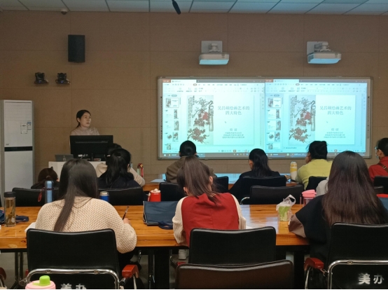 10月22日上午8:00艺术楼217,应beat365官网邀请,殷丽老师为国培学员进行了题为《写意花鸟鉴赏》的专题讲座,让学员深入了解吴昌硕、任伯年及王雪涛的绘画艺术,解析谢赫的六法论并讲解如何取得更好的画面,并为学员做示范,让学员更好的理解写意花鸟。