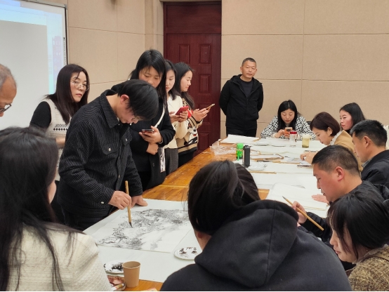 曹老师通过对田园山水画的认知、田园山水画的范畴、田园山水画的演变、田园山水画的艺术特点等基础理论知识的讲解,使学员对田园山水画有了最基本的认识。随后,曹老师为学员们进行现场示范。绘画过程中,曹老师充分利用绘画技法,做到理论与实践相结合,让学员对田园山水画的创作与绘画技法有了更加清晰和深刻地理解。示范过后,学员们提出自己的疑惑和问题,曹老师耐心细致地解答,学员们表示收获颇丰。
