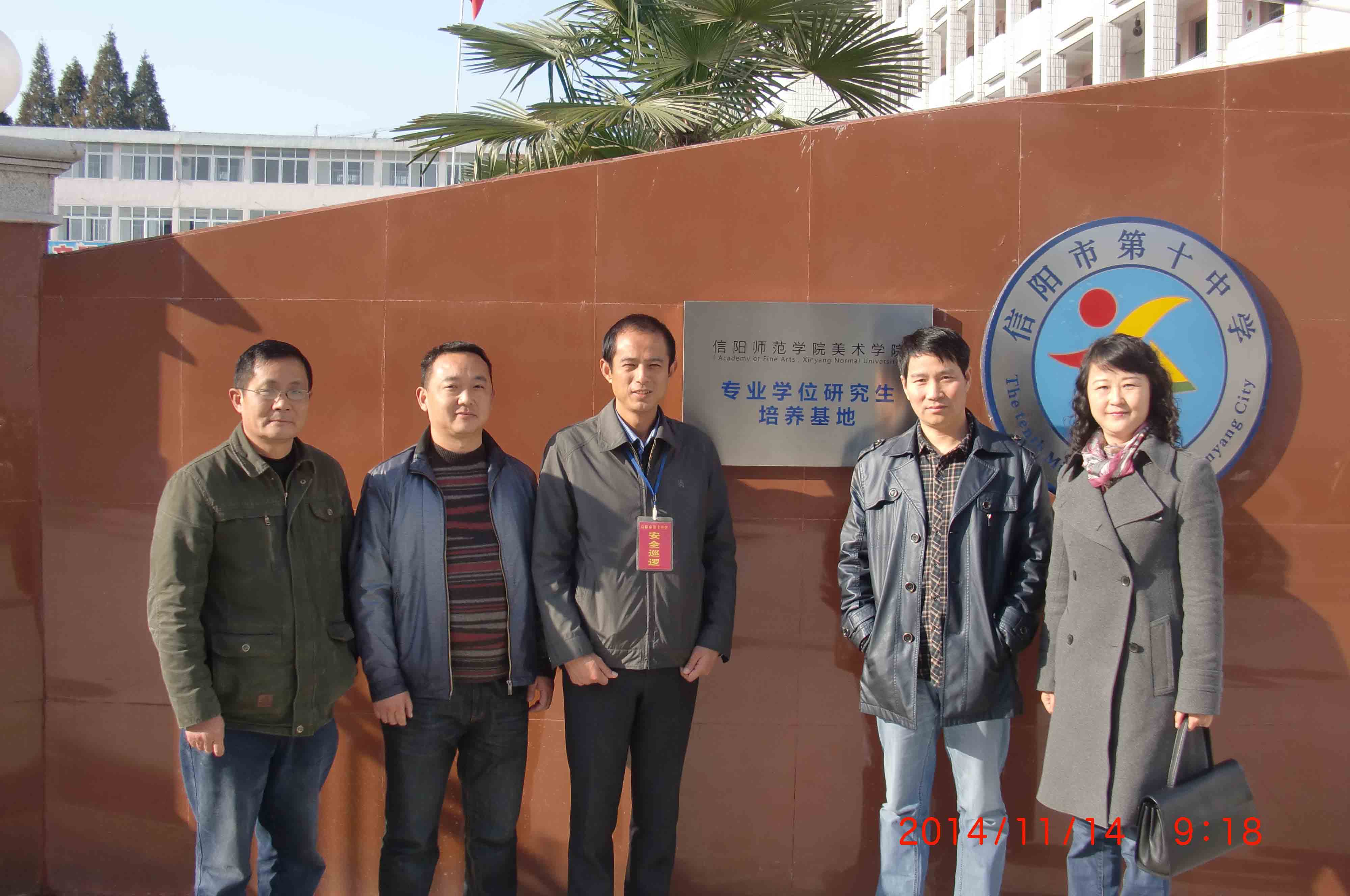2014年11月14日上午,信阳师范学院美术学院教育硕士研究生实践基地挂牌仪式在信阳市第十中学隆重举行。信阳师范学院美术学院副院长邹东升,美术学院研究生教学秘书涂湘东,信阳市第十中学校长朱继来,第十中学美术教师王信达等相关领导同志出席了挂牌仪式。