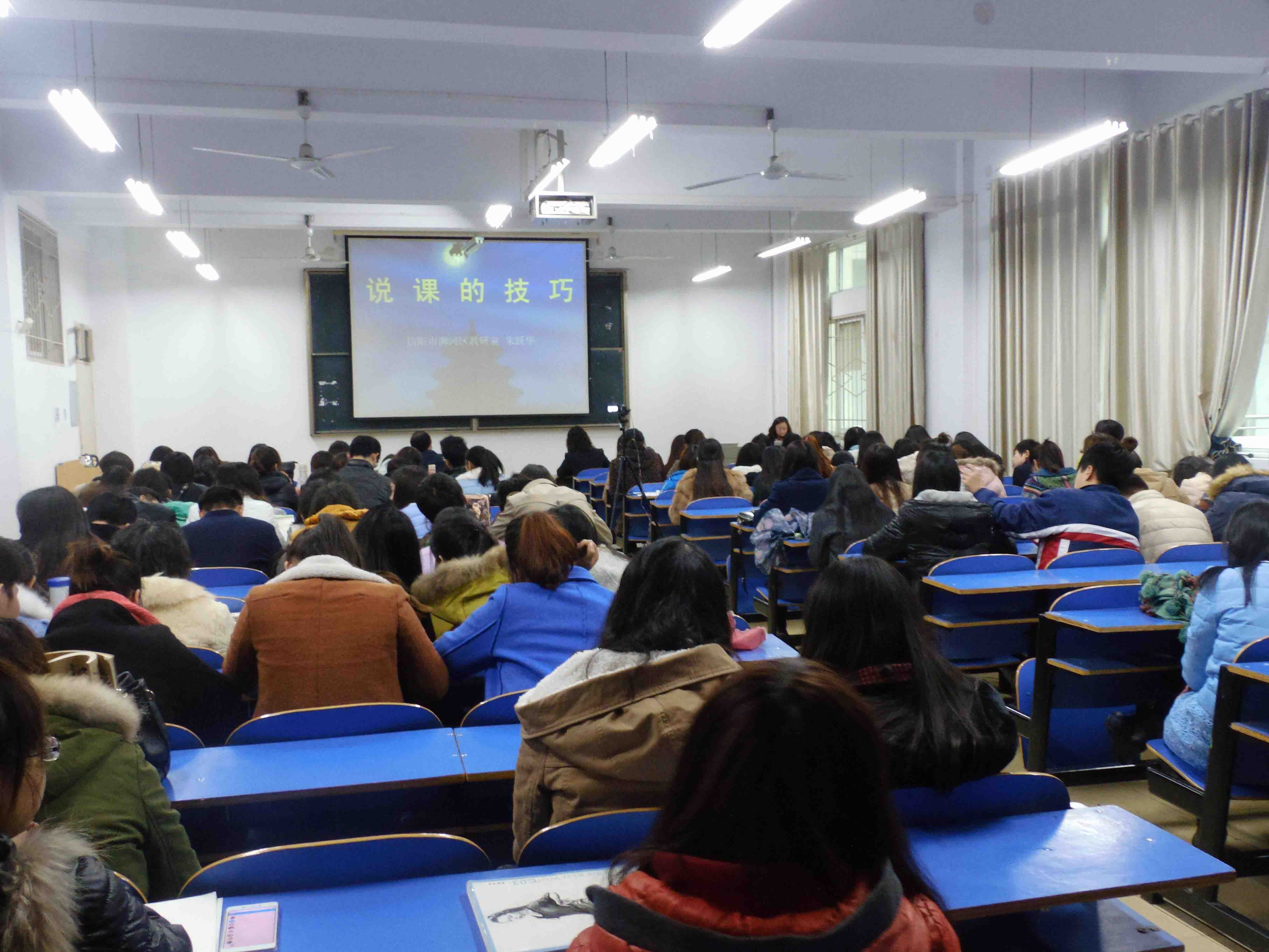 朱继来老师作为一线教学管理人员,他在简要介绍学校的基本情况以后,重点探讨了关于如何在新形势下提升我们的课堂教学的成效,最终目的是推动基础教育课程的优质均衡发展,办教师幸福、学生快乐、群众满意的好教育。二是与美术学院关于教育硕士的实践环节:双方共同为培养好高素质、高水平的教育人才而努力奋斗。紧接着,来自信阳市浉河区教体局的朱跃华老师为我们带来了题为“说课的技巧”的讲座,朱跃华老师通过对于美术教育的专业性思考,将自己的感想和经验传授给了到场的学子们,两位老师的学术讲座图文并茂、动静结合、深入浅出,非常实用,十分精彩。获得在场师生的一致好评。讲座的最后,与会同学就教师招聘政策及教育管理等方面的问题与朱继来校长和朱跃华老师进行了丰富的互动,两位老师并逐一耐心地解答了大家的问题。
