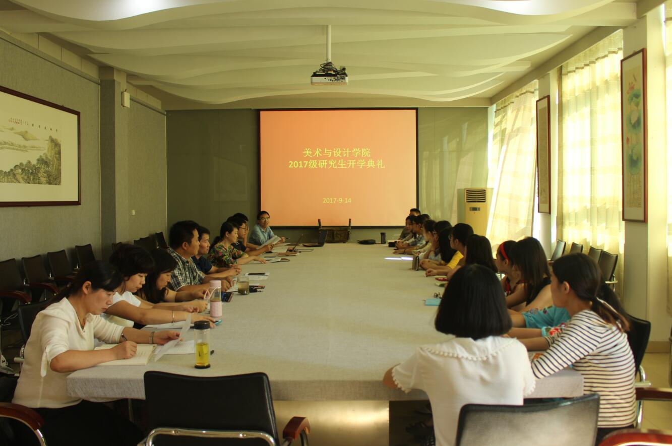 9月14日,beat365英国官方网站2017级研究生开班典礼于艺术楼会议室召开。beat365官网副院长邹东升、张伟、李孝民、涂湘东,党委副书记杨轶中,研究生教学秘书刘文忠,导师卢敏、潘静、郑蔚、高正及2017级全体研究生出席本次会议。典礼由涂湘东主持。