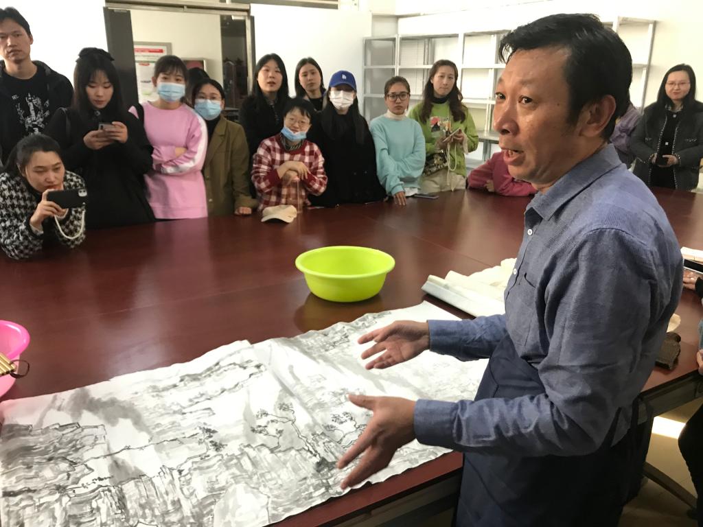 杨冬平向同学们介绍了装裱的基本知识。他指出,装裱是我国特有的一种保护、美化书画以及碑帖的技术,使作品能够达到更高的艺术美感。杨冬平以优秀书画家与装裱艺术家的代表人物米芾的事例进行了具体说明。