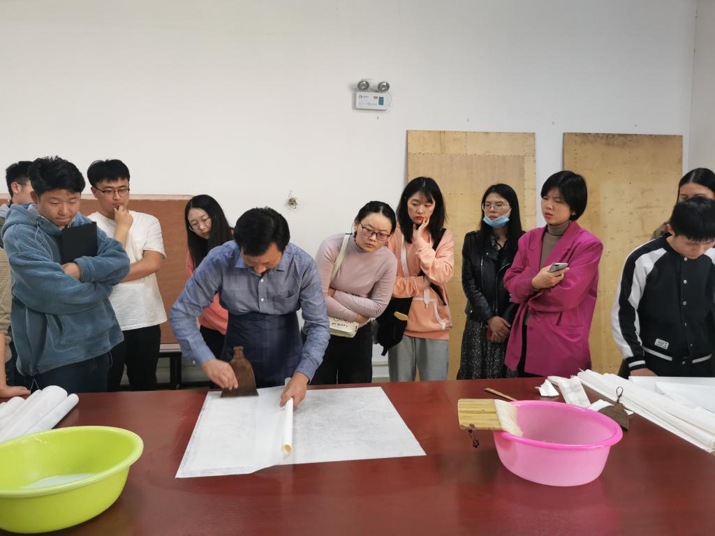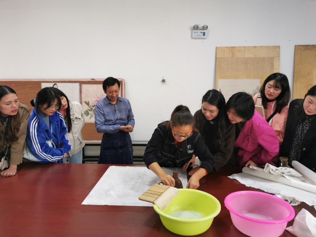 最后杨冬平指导学生进行装裱实践,对学生进行细心讲解,亲身示范。同学们踊跃参与,热情投入,收获颇丰。