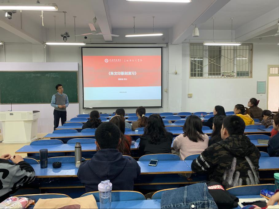 10月18日下午,beat365官网栗跃崇博士在艺术楼多媒体教室307作了题为“朱文印篆刻演习”的专题学术讲座,全体研究生参加了此次讲座。