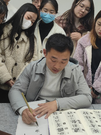 从探索和学习古人所处环境、坐姿以及拿笔的姿势来临摹名家字帖,让学生逐步产生对书法的兴趣,从而学到全面、系统、正确的书法。整场学术报告持续了近两个小时,以热烈的掌声圆满结束。