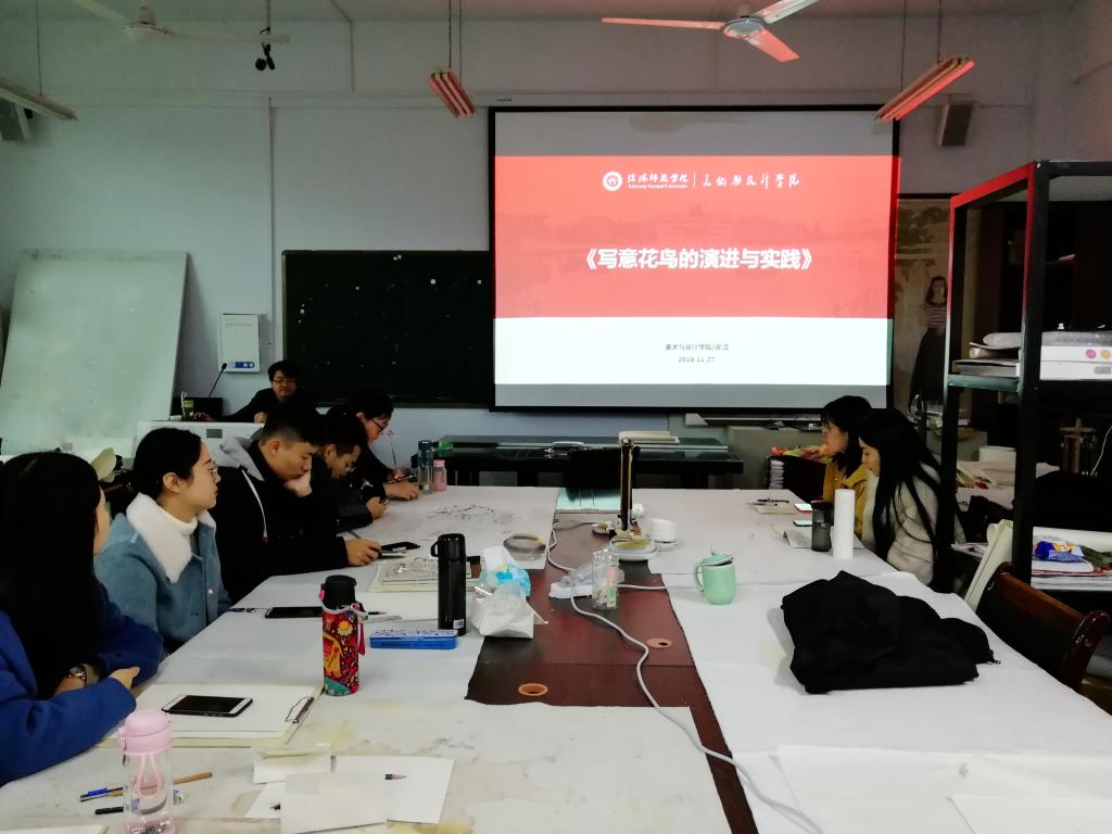 11月27日上午,beat365官网翟洁副教授在艺术楼研究生教室作了题为“写意花鸟的演进与实践”的专题学术讲座,全体研究生参加此次讲座并积极讨论。