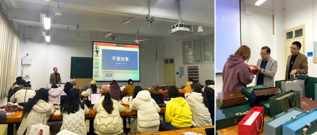 徐锋从传递品牌价值、塑造品牌形象与打造差异化视觉识别力三个方面分析了包装与品牌的关系,并对包装的色彩与元素设计、材质与结构设计进行了案例讲解。在互动环节,随机选取学生挑选自己喜欢的礼盒进行材料与工艺的讲解,徐锋进行纠正和答疑。