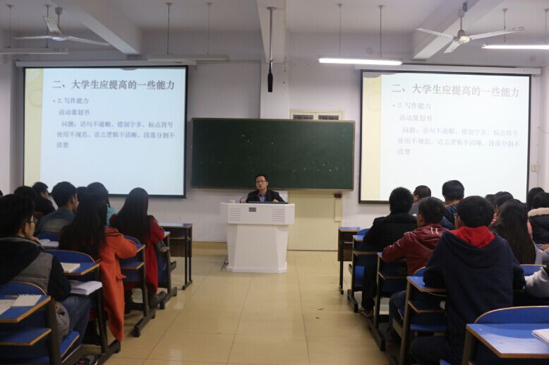 此前,11月19日晚校党委学工部思想政治教育科科长余伟应邀为分党校学员做了题为《漫谈大学生的综合能力提升》的专题讲座。余伟由一篇文章切入,全面细致的剖析了出现问题的原因;大学生应提高的一些能力;大学生应具备的一些素质。课上,余伟还与同学们分享了许多自己的生活感受,提醒大家要提高阅读、写作能力,人与人之间的沟通交流能力以及实践动手能力。并且应该多些宽容与责任担当,努力培育和践行社会主义核心价值观。(樊诗雅 乔文静 供稿)