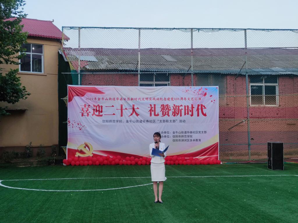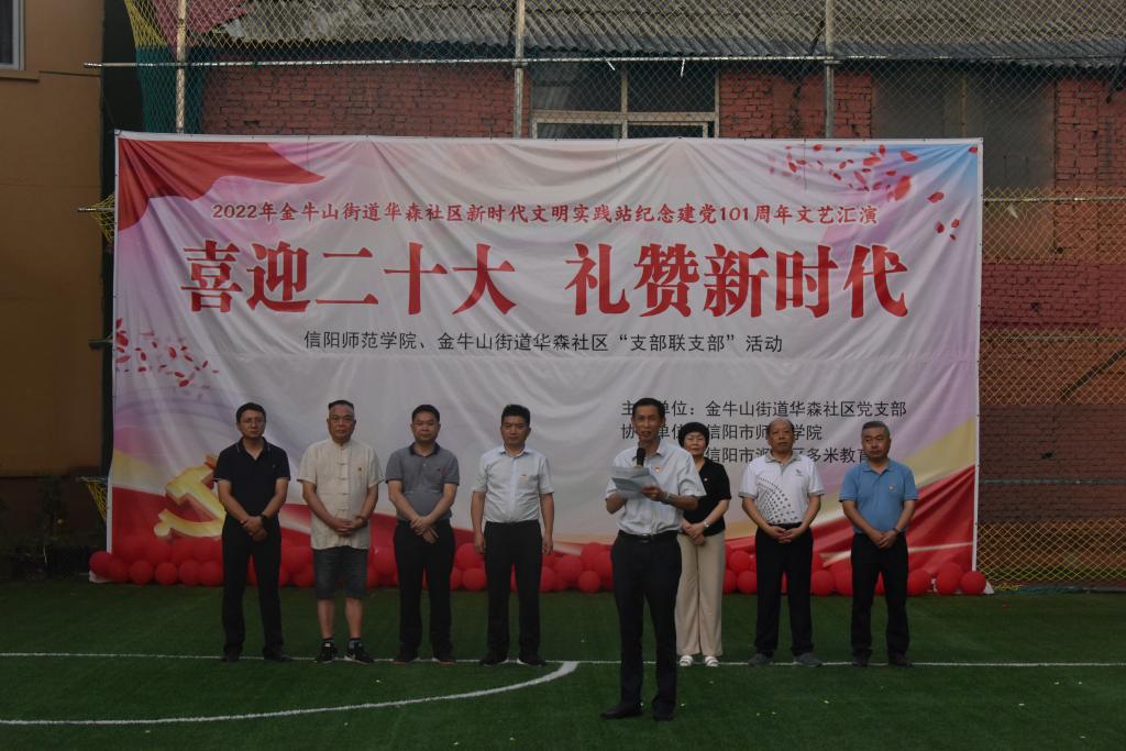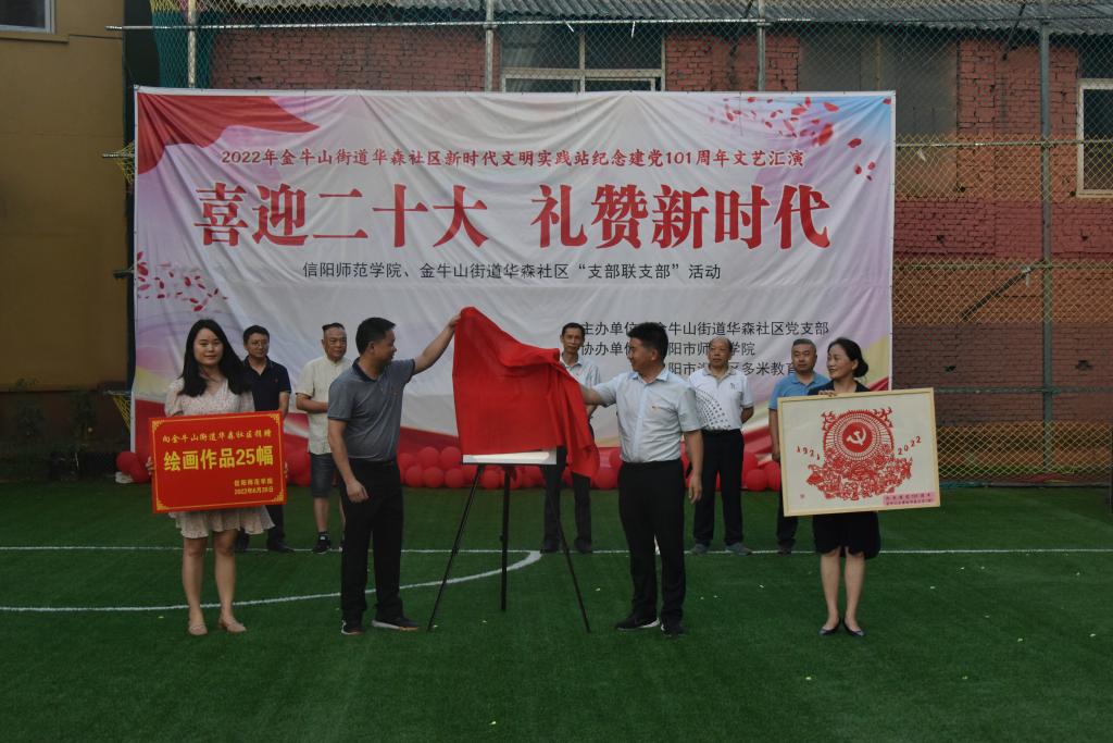 6月28日,beat365官网与金牛山华森社区党支部在多米礼仪幼儿园联合开展“支部联支部”文艺进社区活动,举行了艺术作品捐赠仪式和“喜迎二十大礼赞新时代”庆祝建党101周年文艺汇演。校党委组织部部长岳宗德、副部长赵晨、beat365官网党委书记兰洋、副书记周刚、金牛山街道党工委书记涂延海、美术学学生第一党支部书记郑波、研究生党支部书记邹青宸、社区党支部成员及当地群众共同参加了本次活动。