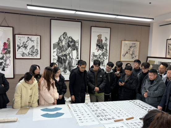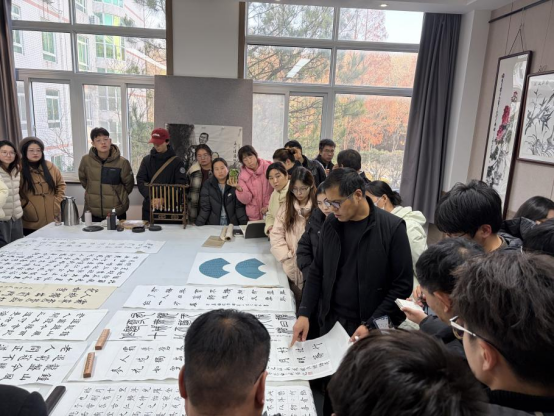熊愚教授对研究生书法作品进行了细致点评,在肯定创作亮点与创新思维的同时,也精准指出了存在的共性问题。他特别强调了作品落款的重要性,针对落款格式、字体选用、信息完整性等方面存在的不足,系统讲解了落款的核心规范与排版技巧,引导同学们注重细节、夯实基础,全面提升作品的专业性与艺术表现力。现场气氛热烈,互动积极。同学们纷纷表示,通过此次指导,不仅提升了书法技艺与审美修养,也对书法艺术的文化内涵与教育意义有了更深体会。