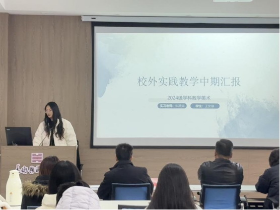 随后,2024级学科教学研究生依次上台,借助PPT全面汇报实习情况。同学们围绕实习目标达成、课堂教学实践、学情分析、家校沟通、教学反思及后续改进计划等内容详细阐述,充分展示了实习以来在教学技能、职业素养等方面的成长与进步,汇报内容详实、重点突出,得到了评委老师们的高度认可。