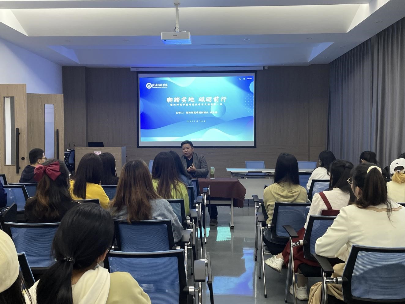 2022年10月15日下午三点,beat365英国官方网站全体研究生在beat365官网实训楼二楼艺研堂观看由信阳师范学院副校长余本海先生主持召开的“研究生学术大讲堂第一讲——脚踏实地砥砺前行”线上直播讲座活动。