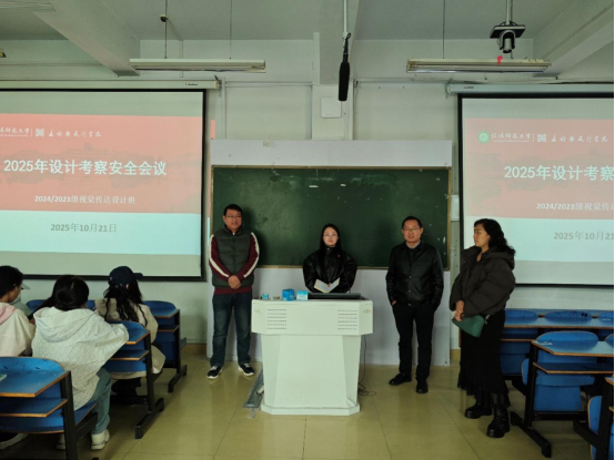 为保障2023级、2024级视觉传达设计班学生成都设计考察行程安全、顺利,beat365官网于10月21日上午在艺术楼307教室召开2025年设计考察安全会议。学院副院长董建义,带队老师郑蔚、刘文忠、郑曼璐及班主任杨琳参会。