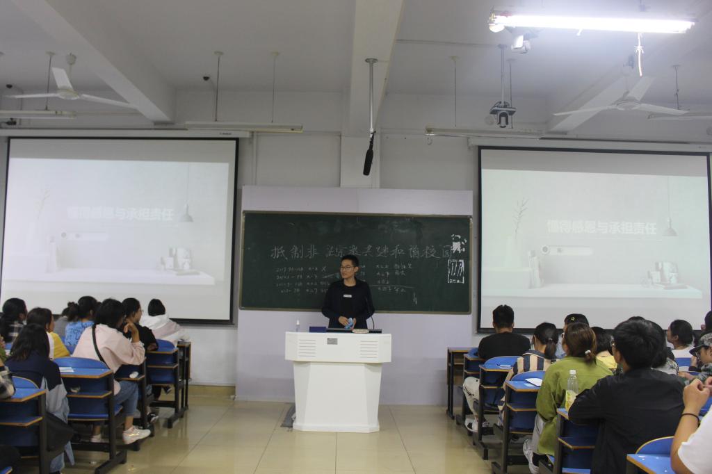 首先,吴迪以感恩校园行为主题,结合ppt加深了同学们对感恩和励志的认识。并以自身的事例用简单的语言和动情的真实故事演讲,阐述了感恩的真实内涵。他希望大家能够感恩经历的一切好的、坏的事物,努力地在感恩中励志成长,不断成为更加优秀的人。接着,陈俭明讲述了他在初入大学时的困惑,用真诚与坦率让大家了解到在大学里确定目标的重要性。并分享了他在学生会任职期间的工作与学习,亲切朴实的话语,每一句都在鼓励着大一新生以一种更加积极的态度去适应大学的生活,学会担当,更要懂得感恩。最后,他们鼓励同学们要坚定理想信念,有目标的学习,懂得感恩,回报社会,为将来走上社会打好基础。两位学长语言风趣幽默,现场氛围十分融洽。