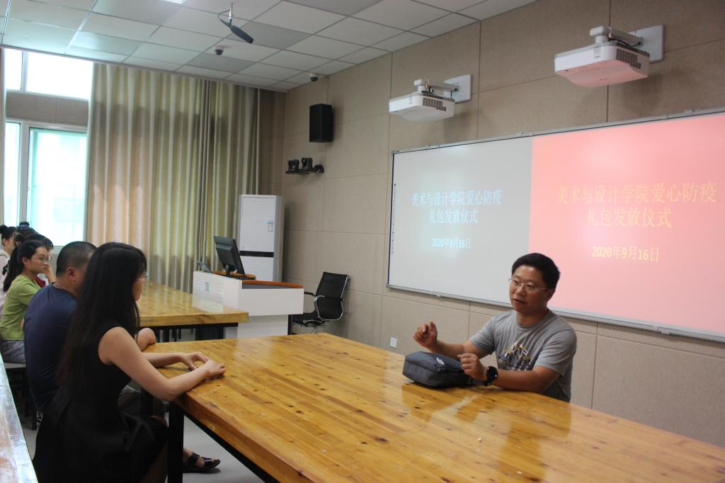9月16日,beat365官网于艺术楼217教室举办爱心防疫包发放仪式。党委副书记杨轶中,团委老师郑波,班主任邹青宸、张暄以及学生代表共同参加。发放仪式由杨轶中主持。