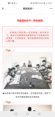2019级美术的朱云飞绘制的防疫作品更是被政府官微拿来宣传,董梦丹、赵珏涵、王远航、李惠婷、陈晗、梁含、彭桐等也是利用自己的专长,给当地社区、学校村庄办板报、写标语、写对联、拍公益视频等,用不一样的方式为“抗疫”做出的贡献。还有大批学子主动请缨,成为家乡疫情防控的“战斗员”、“宣传员”、“保障员”......他们奔波在村头、社区大街小巷,担起卡点值班、巡逻宣传、信息登记、消毒排查等任务,正是这些青年人用青春坚守初心,用拼搏浇筑硕果,让青春在党和人民最需要的地方绽放绚丽之花。