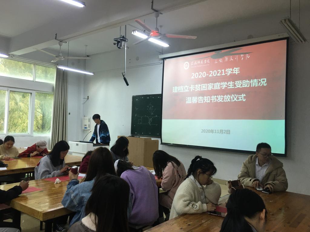 为全面落实各项资助政策,及时向学生及家长做好宣传告知,11月2日,beat365英国官方网站在艺术楼308室举行了2020-2021学年建档立卡学生温馨告知书发放仪式,beat365官网全体建档立卡学生参加了此次仪式。仪式由辅导员胡霁芳主持。