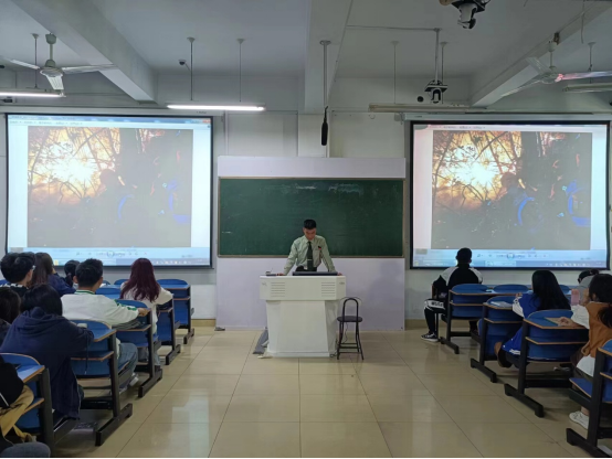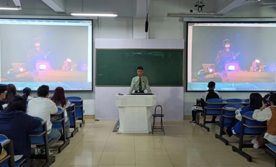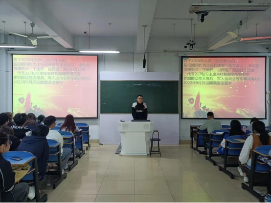 10月10日下午,艺术楼307教室开展了一堂新时代爱国主义教育宣讲会。退役大学生刘文虎、崔亚杰应邀来到这里,分别向台下的同学们讲述了自己精彩丰富的军旅生活。