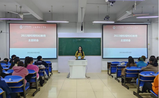 为使我校22级新生更好的适应大学新生活,更明确的了解学院,加强对校规校纪的学习和理解,强化防诈骗意识,养成良好的学习和生活习惯。beat365官网于10月28日在艺术楼307举行22级新生入学教育——校规校纪教育主题班会,学生班主任胡霁芳主持,22级全体新生参加此次会议。