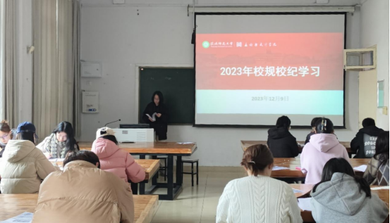 班会集中学,实现校规校纪学习全覆盖。11月15日至11月30日,新生辅导员通过集体班会,为2023级新生讲解了校规校纪相关内容,详细介绍了学校制度赋予的学生权益、应遵守的义务及违反校规校纪面临的纪律处理。同时,提醒学生要心有所畏,言有所戒,行有所止,树立起良好的新时代大学生形象,并强调大家课后要多学习相关制度,对于学校制度要熟记于心。