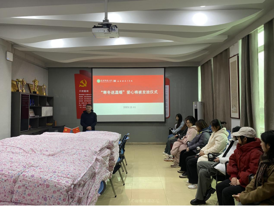 发放伊始,周刚对同学们表示关怀和慰问,嘱咐大家近日寒冬来袭,要做好防寒保暖措施。他强调,“棉被虽小,其情也深”是学校对同学关心的具体体现,希望同学们珍惜时光,认真学习,有困难及时向学院反馈,向辅导员反映,学院是大家共同的家园,是同学们坚强的后盾,学院也会持续完善资助育人体系,确保每一位有需要的同学都能得到及时的援助。