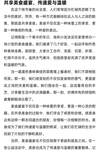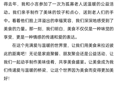 经过专业评审团队的精心评选,一批优秀的征文作品脱颖而出。这些作品不仅展示了学生们的才华和创意,更在无形中培养了他们的阅读兴趣和写作能力。通过参与活动,同学们不仅学会了如何更好地珍惜粮食,还感受到了美食文化的魅力和乐趣。