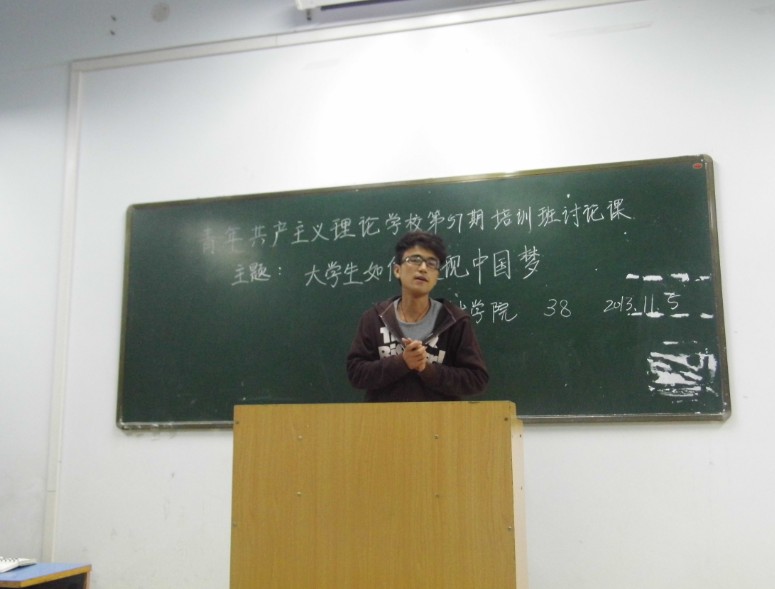 11月5日晚,信阳师范学院美术学院第57期青校学员在艺术楼308教室开展了主题为“大学生如何实现中国梦”的讨论课,美术学院全体青校学员共38人参加了本次课程,活动由美术学院本期青校组长主持
