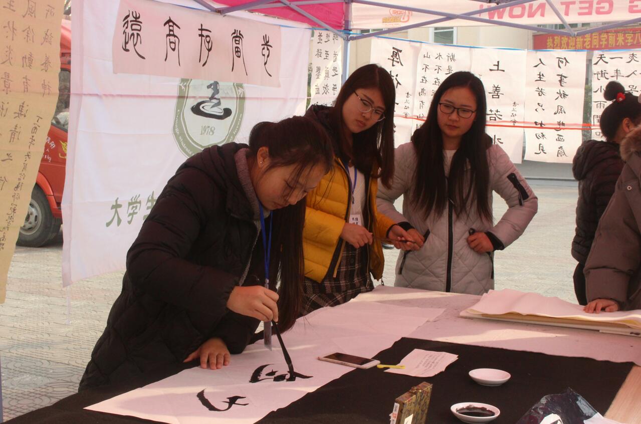 为推进校园书法文化的传播,提高在校学子综合素质,12月30日,由beat365英国官方网站团委主办,大学生书法爱好者协会承办的“翰墨飘香赠佳人”书法大赛于八餐小广场前火热举办。