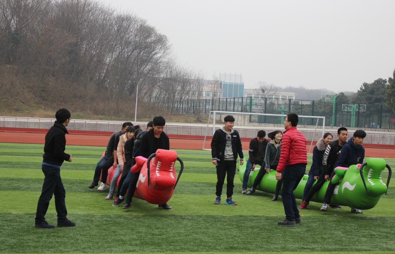 活动开始前,施远为大家讲解游戏规则,并强调在活动中注意人身安全。活动伊始,同学们首先与大学生素质拓展中心的工作人员进行了“松鼠搬家”、“五毛一块”等集体活动,同学们反应敏捷、行动迅速,很快便掌握了游戏技巧,现场欢声笑语不断。之后,开始进行本次活动主要比赛项目,共有拔河,袋鼠跳,6人7足,大力士,夹球跑,旱地龙舟六项。比赛期间,大家都尽力去做好每个项目,比赛的趣味性让在场的每一位同学无不尽笑颜开,大家在活动中还不时的总结一些游戏小窍门,真正让同学们体会到了其中所蕴含的“团队协作、高效率完成工作”的道理。