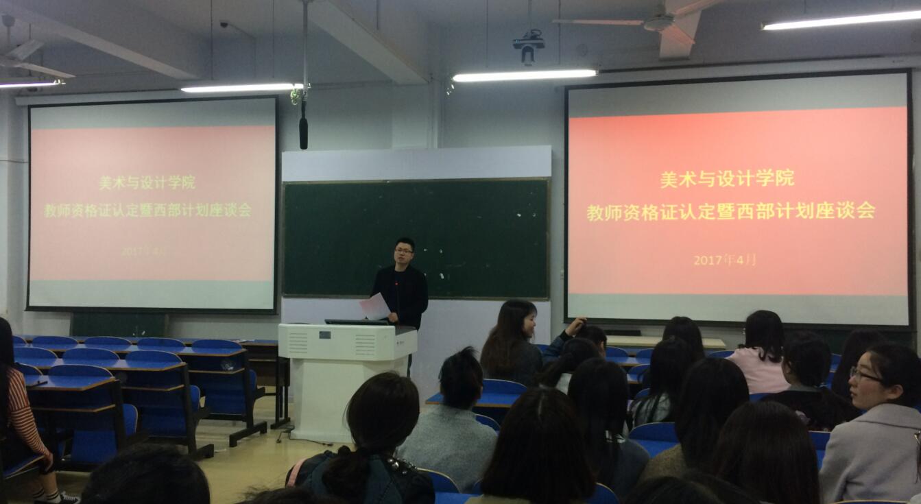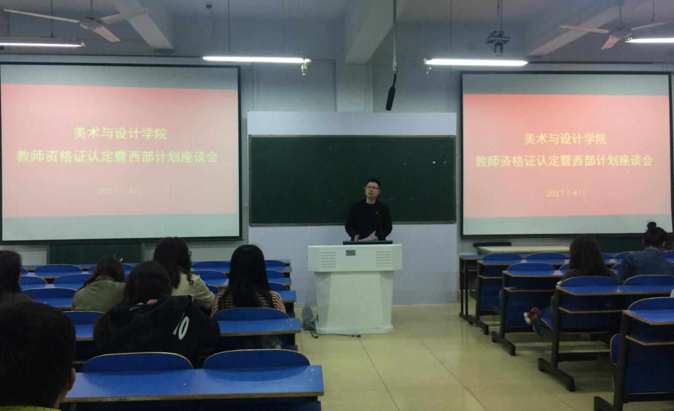 4月12日晚,beat365英国官方网站于艺术楼307室召开教师资格证认定暨西部计划座谈会,beat365官网团委书记张锐和13级美术学班全体学生共同参加了本次座谈会。