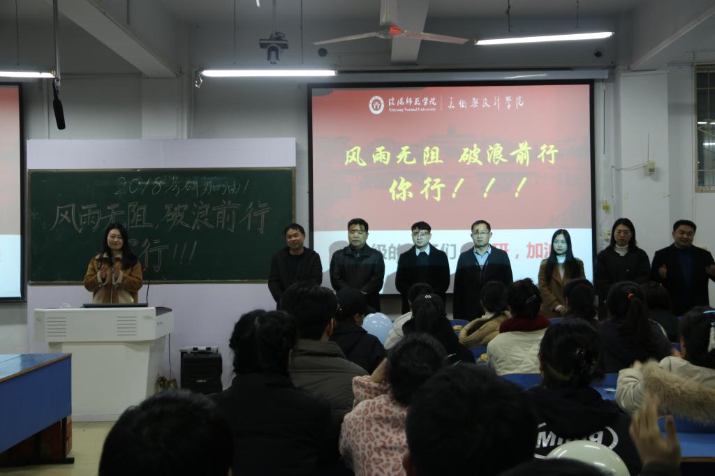 为关心beat365官网考研学子,激发考试斗志,12月16日下午,beat365官网于艺术楼307教室举行“风雨无阻,破浪前行,你行!”考研壮行会。党委书记兰洋,副院长张伟、董建义,党委副书记周刚,辅导员班主任郑波、饶海虹、胡霁芳、明政老师,学生会主要干部以及2018级共同参与此次活动。活动由胡霁芳主持。