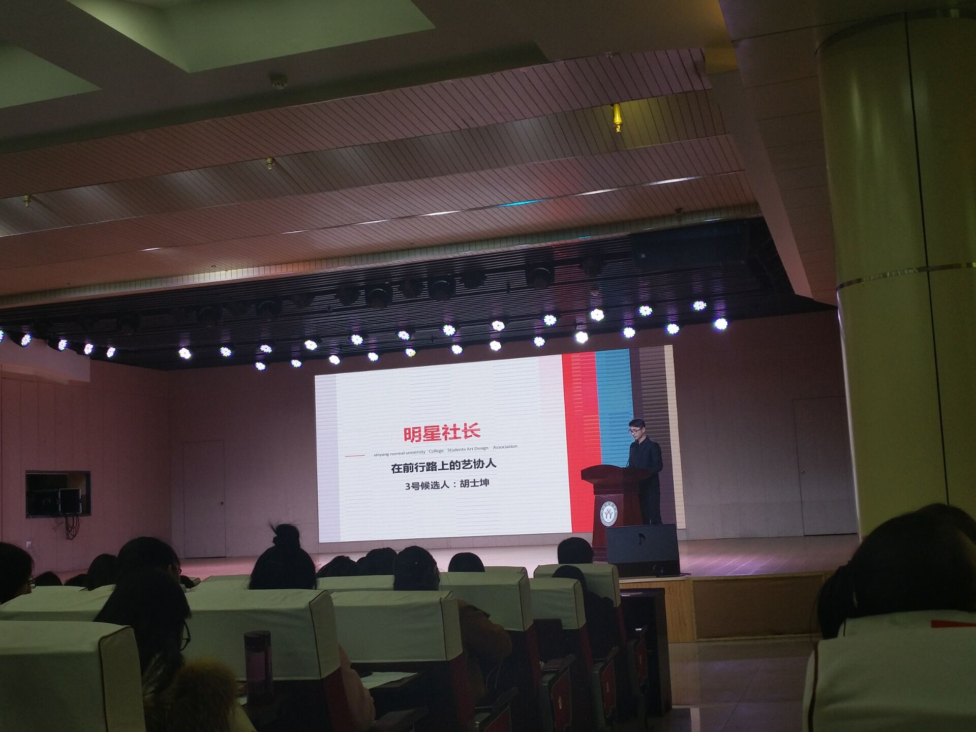 12月8日,由校团委,社团联合会主办的“明星社长”选拔赛在理科楼报告厅成功举办,其中beat365英国官方网站第十一届大学生艺术设计协会会长胡士坤作为候选人之一参与评选,各院团总支书记,社团指导老师担任评委,现场气氛热烈,座无虚席。