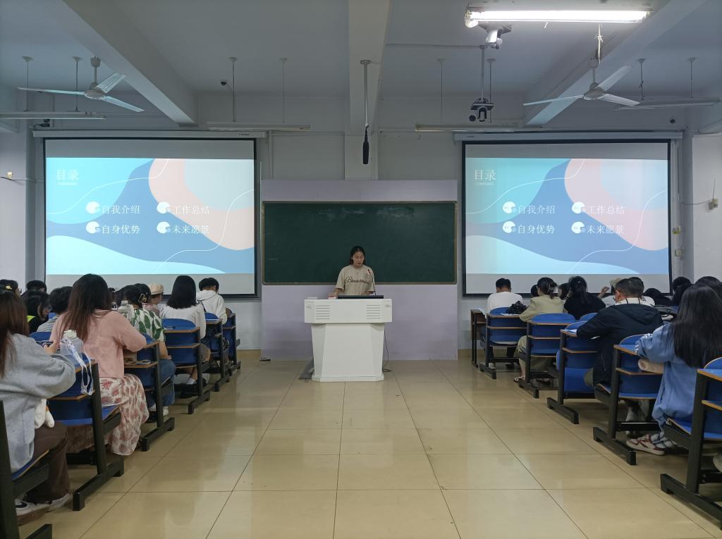 大会竞选在王远航致开幕词后正式开始。会上,各部门竞选人依次上台进行演讲,并结合PPT根据自身特点,对学生会、竞选职务的认识和工作思路进行阐述。竞选者们准备充分,表述了自己此次竞选的优势与竞争力,展现了她们愿为学院付出的决心及对后续工作的展望。面对几位评委的提问,竞选者们积极思考,发挥自己的聪明才智,提出自己的观念并作答。演讲结束后,秉承着公平公正的原则,评委老师、上一届主席团成员及各部门干事进行选举投票,选出合适候选人。