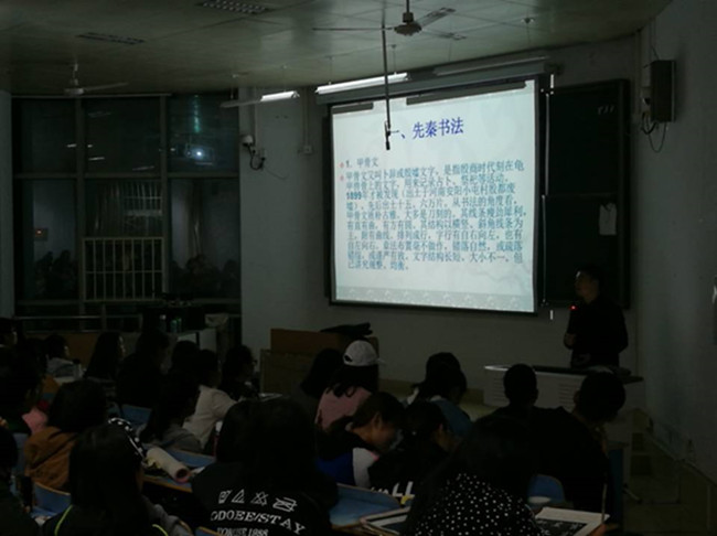 协会会长王海豹对社团的结构、社团的目标、社团的发展进行了阐述。张峰老师就初学者该如何选帖、历代笔法流变的不同、字体演变、器物学知识等方面进行了详细讲解。张峰老师的讲解让在场的学生对书法史有了更加深刻的理解和认识,有学生表示回去后要努力学习知识,努力练习书法,将中国的传统文化进行继承和发扬。