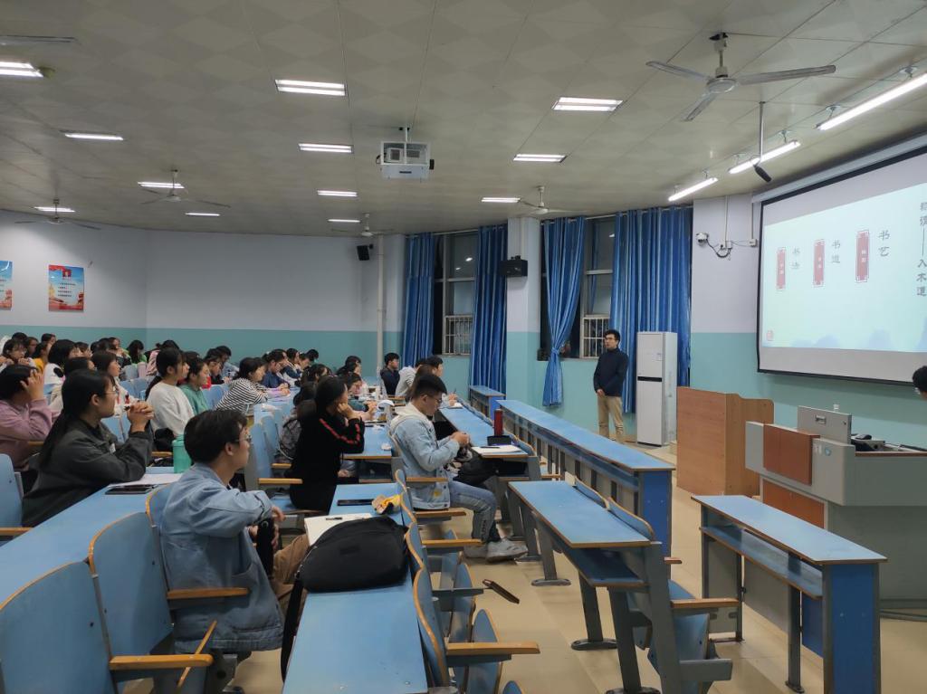 会议伊始,栗跃崇向同学们讲解了有关书法的专业知识,让同学们对书法有一个整体的了解。而后又以ppt的形式对书法、书道以及书艺三个方面分别进行了介绍。粟跃崇旁征博引、深入浅出,同学们认真聆听,仔细记录,积极发表自己的看法并表示对以后在协会的工作与活动充满期待。讲座现场氛围活跃,师生交流不断。