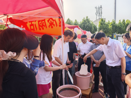 5月27日,校心理健康教育中心在东操场举行了心理游园会,beat365官网承办的“漆韵华章,扇韵心灵”非遗漆扇制作活动成功开展,共有200余名学生的报名参加。校党委副书记、工会主席岳宗德,学生处副处长兼大学生心理健康辅导中心主任李贵杰、学生处副处长杨乐及学院党委书记兰洋、副书记周刚等领导亲临现场指导工作,与同学们共同制作漆扇,并给予该活动高度评价。