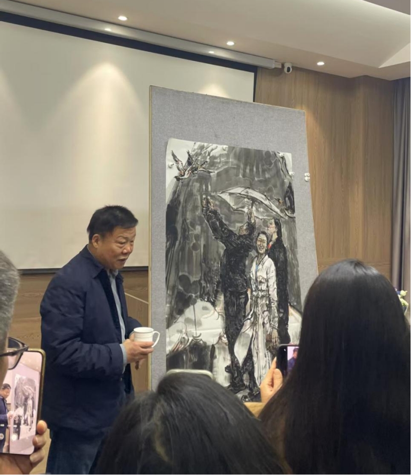 讲座中,袁汝波围绕主题,系统阐述了人物画创作的核心要义。他指出,人物画创作的重点在于“以形写神,形神兼备”,需通过笔墨语言精准捕捉人物的精神气质与内在情感。他强调,造型精准是创作基础,创作者需深入把握人体结构与动态规律,以线条勾勒轮廓、塑造体积,注重线条的力道与节奏;人物刻画贵在传神,应聚焦眼神、表情及肢体细节,通过眼神传递人物情绪,以细微动态展现身份性格,而非单纯复刻外貌。关于笔墨技法,袁教授提到,线条需讲究“中锋用笔”,墨色要体现浓淡干湿变化,通过笔墨的层次感表现人物衣纹、质感与空间关系;同时,要注重画面的意境营造与留白艺术,使观者聚焦人物本身,通过环境烘托深化画面意境。