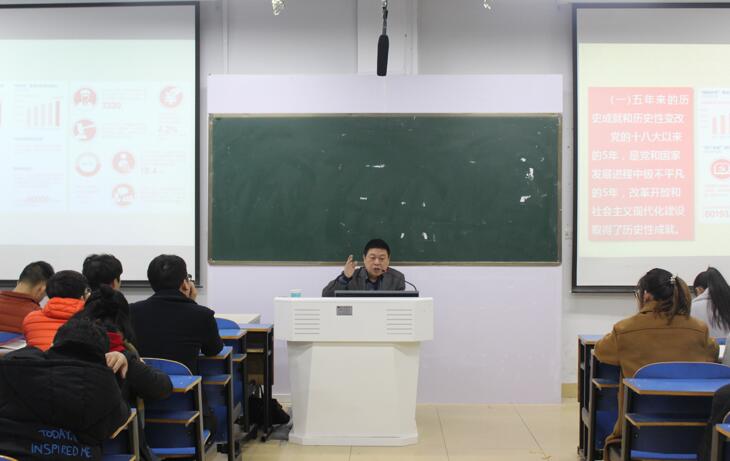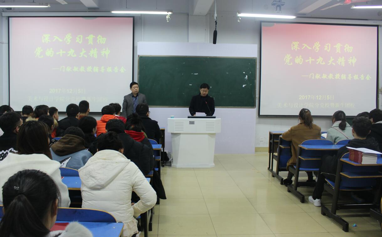12月5日,应beat365英国官方网站之邀,门献敏教授于艺术楼307室召开“绘就伟大梦想新蓝图 开启伟大事业新时代——深入学习贯彻党的十九大精神”辅导报告会,beat365官网党委副书记杨轶中,辅导员饶海虹出席了本次会议,全体学生党员、青校学员及班级学生干部认真聆听了此次报告会。报告会由杨轶中主持。