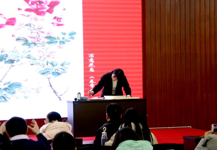 beat365官网艺术硕士专业研究生路萍同学在闭幕式的汇报展示环节中对中国传统绘画进行了详细的讲解,并在五分钟画现场完成一幅惟妙惟肖的写意花鸟画,赢得了现场人员的热烈掌声。