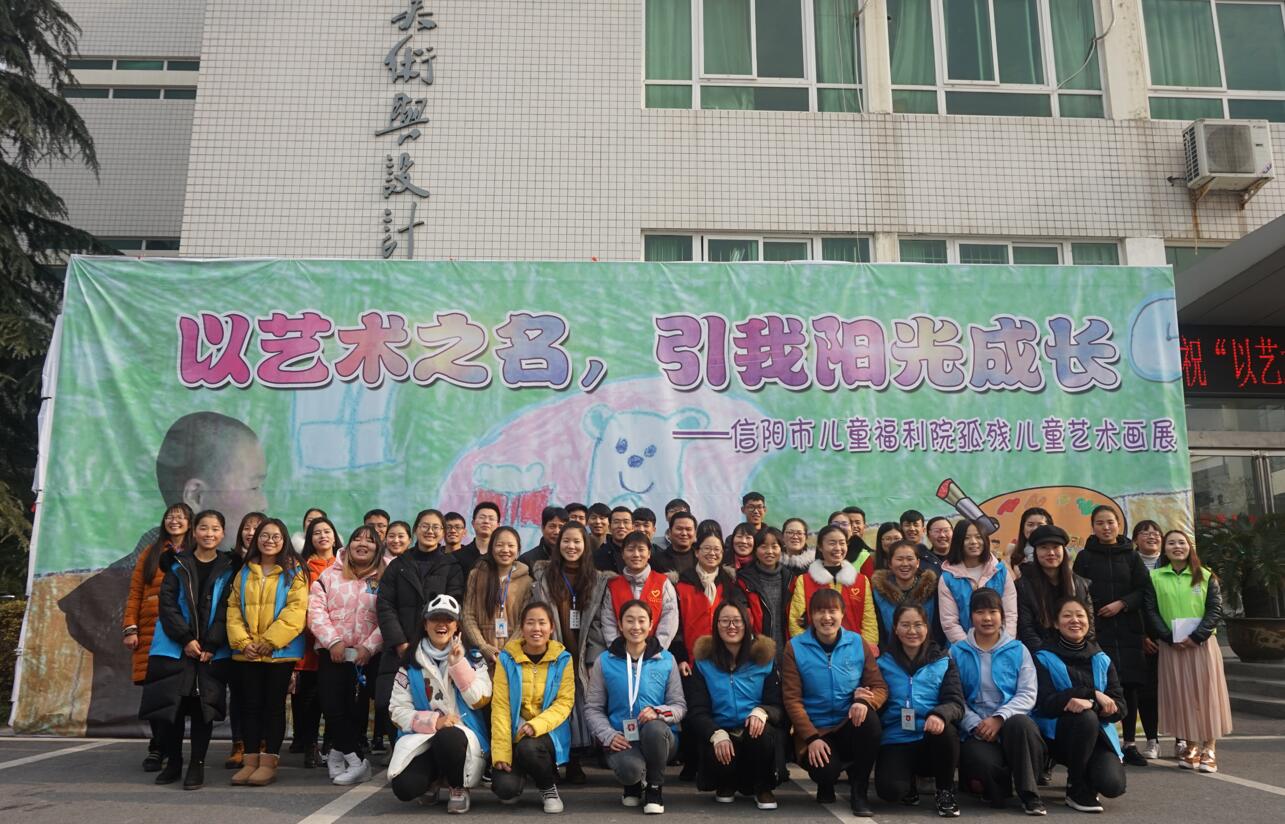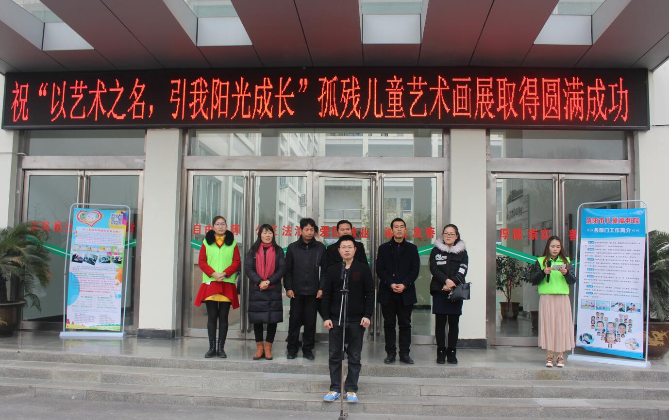 为呼吁广大师生关爱弱势群体传递爱与温暖,12月23日上午,由信阳市儿童福利院和信阳欣和社工主办,信阳市民政局、信阳市儿童福利院、信阳师范学院校团委、beat365英国官方网站团委、法学与社会学院团委、信阳师范学院社会工作协会、信阳师范学院大学生书法爱好者协会、信阳师范学院大学生艺术爱好者协会、信阳师范学院啄木鸟心益社、信阳师范学院生科青年志愿者协会、信阳师范学院远方文学社共同承办的“以艺术之名,引我阳光成长”孤残儿童艺术画展在艺术楼隆重开幕。信阳师范学院团委副书记朱国朋、法学与社会学学院副院长贾义保、法学与社会学学院团委书记袁艳红、beat365英国官方网站团委书记张锐、地理科学学院团委老师姚玉坤、信阳市福利院院长余新再以及百余名学生出席开幕式。开幕式由志愿者李亚楠主持。