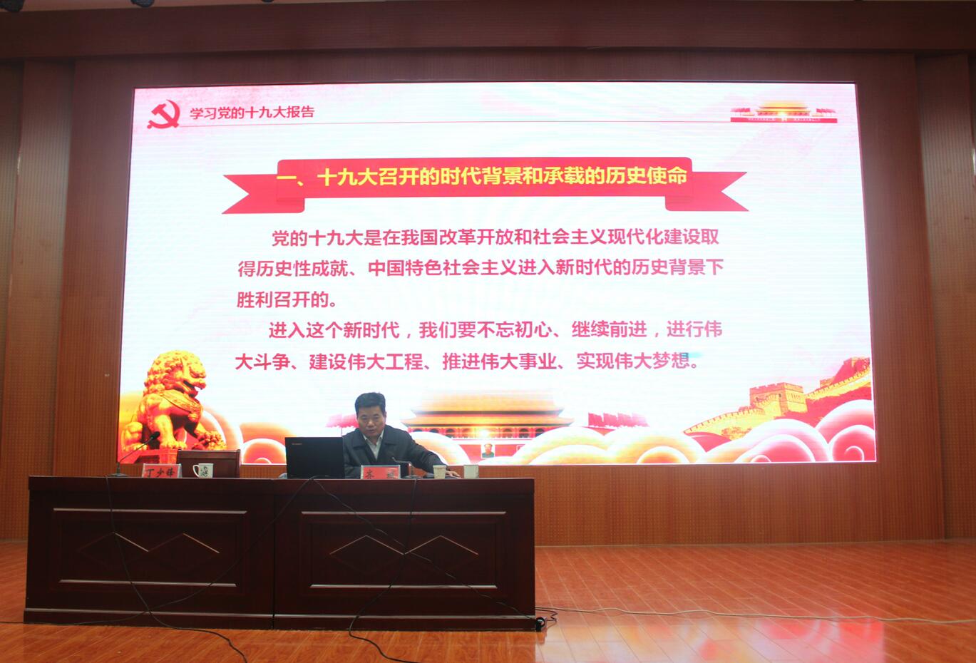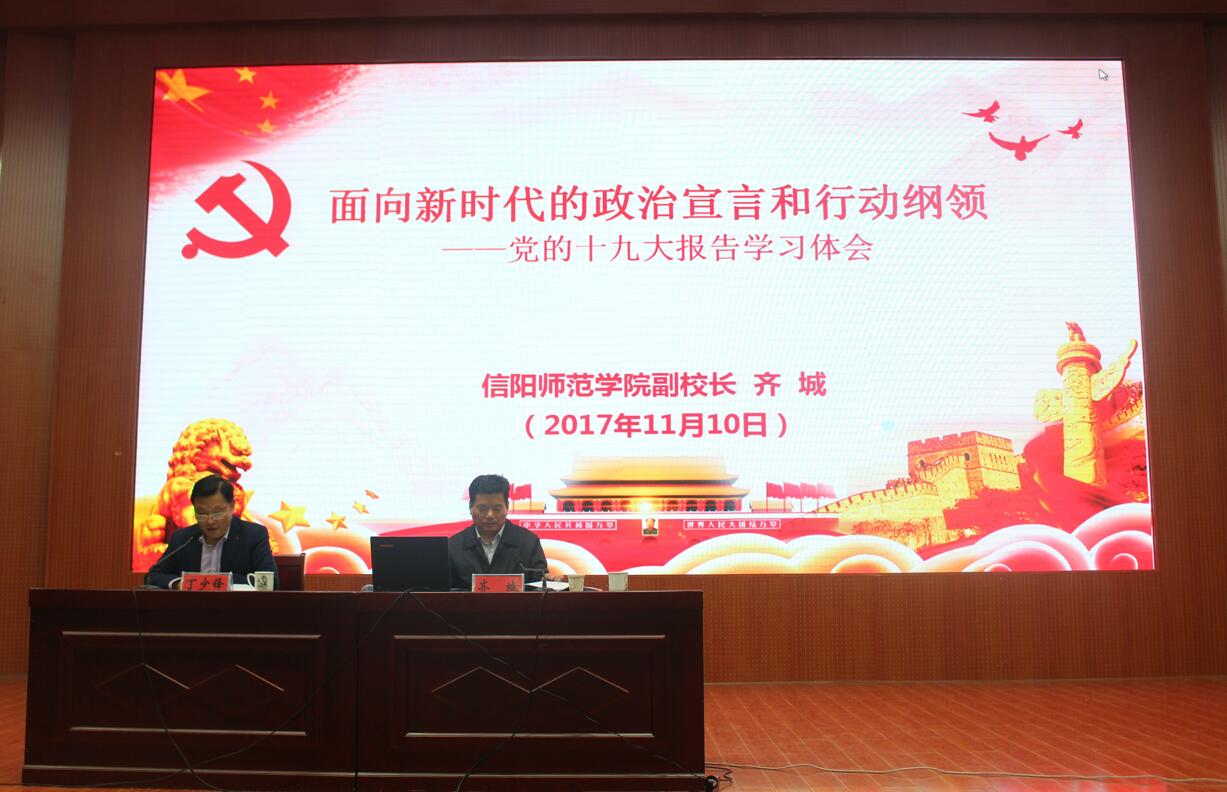 为深入学习贯彻党的十九大精神,11月10日晚,副校长齐城在逸夫楼报告厅作了《面向新时代的政治宣言和行动纲领——党的十九大报告学习体会》的专题辅导报告,beat365英国官方网站、文学院、外国语学院党政领导班子成员、教师党员及五百余名学生代表聆听了报告会。报告会由党委宣传部部长丁少峰主持。