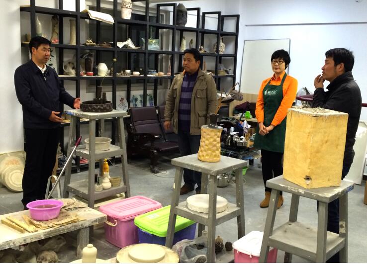 宋书记首先到beat365英国官方网站陶艺工作室详细了解工作室的运作情况。在工作室的电窑前询问设备的用电情况、产量、使用率等相关问题。听到在场老师讲到工作室的所有产品产自该窑时,他鼓励老师应广泛开展市场调研,使陶瓷作品与地方文化结合,增强产品的创意性、艺术性、实用性,加大产品的研发力度,努力打造一批受市场欢迎的艺术陶瓷产品和创意陶瓷产品,逐步建立起自己的文创艺术陶瓷品牌。同时还强调要增强陶艺工作室与专业课程的对接,使喜欢陶艺的学生都能进到工作室体验、学习,掌握陶艺的创作和烧制方法。