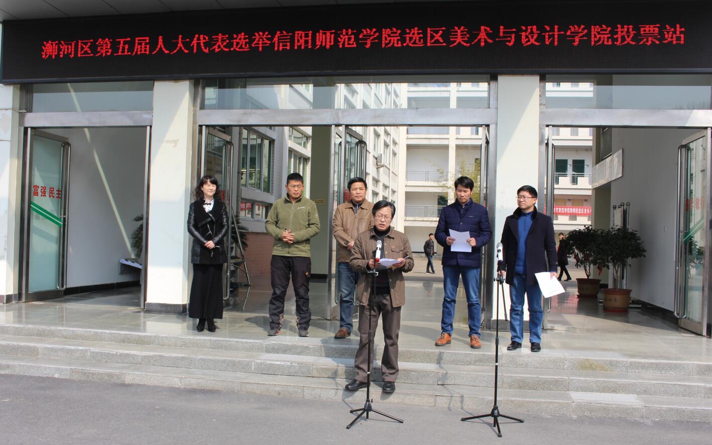 2月24日,浉河区第五届人大代表选举信阳师范学院选区beat365英国官方网站投票工作于艺术楼前顺利展开。beat365英国官方网站院长邹东升,党委副书记杨轶中,副院长张伟、李孝民、涂湘东及beat365官网所有具有选举权的师生共同参与投票。投票选举活动由beat365官网党委书记刘根货主持。