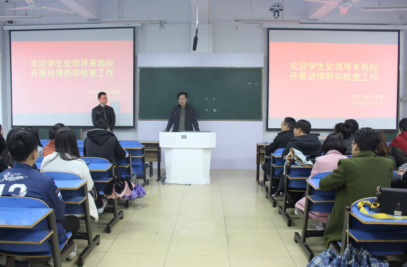 为配合学生处下发的《关于开展辅导员(班主任)班情熟知检查工作的通知》,3月16日下午,beat365英国官方网站于艺术楼307室召开“班情熟知”主题班会,党委学工部副部长陈铭,思想政治教育科李明老师,beat365官网党委书记刘根货,党委副书记杨轶中,辅导员施远、饶海虹及14级视觉传达设计班学生共同参加此次班会,班会由14级视传班班主任张锐主持。