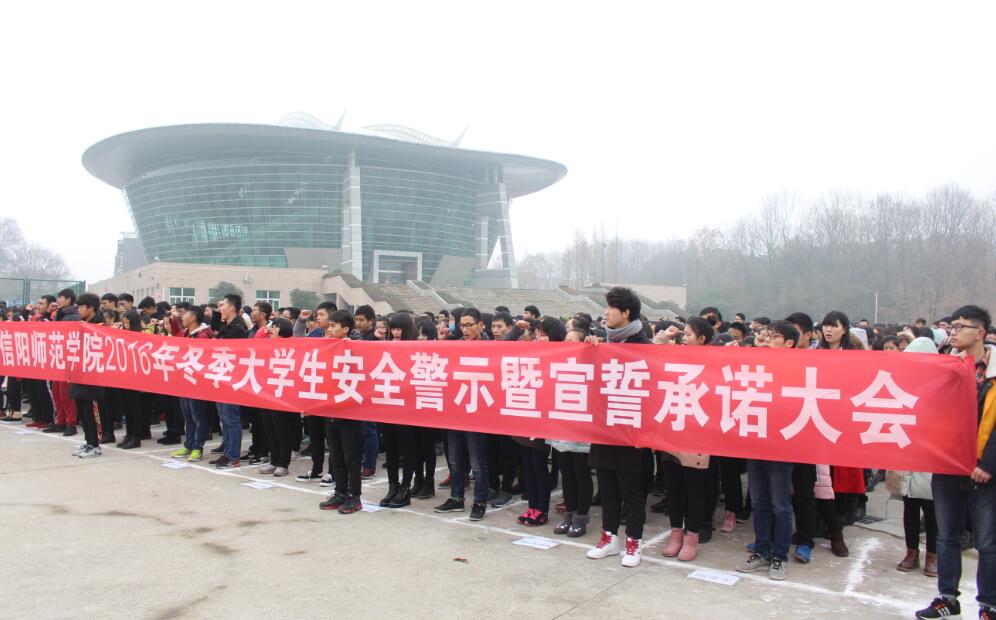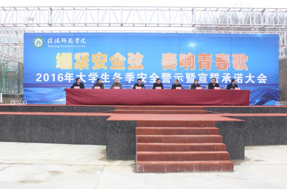 12月13日下午,信阳师范学院校研究生处、保卫处、校团委、后勤服务总公司在青年广场召开“2016年大学生冬季安全警示暨宣誓承诺大会”,校党委副书记、工会主席余作斌,副校长郜火星、齐城及相关部门负责人出席了本次大会,beat365官网学子代表与各院学子一道参加了本次活动。