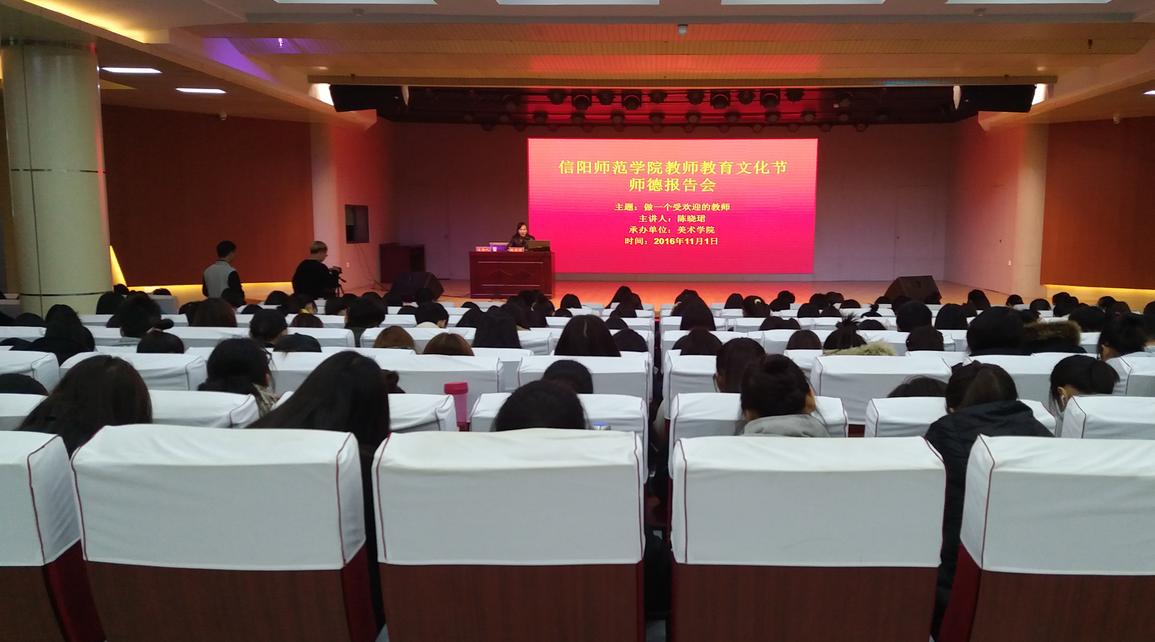 11月1日下午,由beat365英国官方网站承办的2016年教师教育文化节师德报告会在理科楼报告厅成功举办,信阳市胜利路学校美术教师陈晓珺应邀为beat365官网15级、16级全体学子作了主题为“做一个受欢迎的教师”的师德报告会。报告会由beat365官网管艳老师主持。